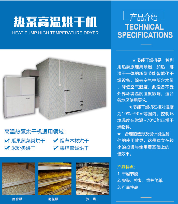 同恩牌熱泵干燥機是一種利用熱泵原理集除濕、加熱,排濕于一體的新型節(jié)能智能化干燥設備,來除去空氣中所含水份,降低空氣濕度,此設備不受外界環(huán)境溫度濕度影響,適合各地區(qū)使用要求。機器采用我公司回熱循環(huán)熱泵除濕方式,拓寬了除濕機在工業(yè)干燥領域的應用,干燥性能比普通熱泵除濕干燥節(jié)能30%以上,大大節(jié)約運行費用;中高溫干燥方式(常溫~70℃),接近自然干燥,被干物品的品質好、色澤好、產品等級高,無污染,而且***環(huán)保衛(wèi)生要求。干燥過程中物料不變形、不開裂、不變色、不變質、不氧化、干燥徹底、干燥后復水性好、營養(yǎng)成分損失少,儲存期長,比任何傳統(tǒng)干燥設備更有效地保護干燥物的色、香、味、個體形態(tài)和有效成分。采用送風循環(huán)脫水并實現物料快速干燥。機組采用觸摸屏全自動控制方式(帶有溫濕度設定,機器故障顯示及工作模式和設定定時開關機、循環(huán)開關機以及時空模式等),性能穩(wěn)定,操作方便。根據客戶需要,可設定不同干燥曲線,滿足不同種類物料干燥,具有適用范圍廣,干燥效果顯著,外形美觀,結構緊湊,功能齊全,運行寧靜,機組獨立放置在庫房外,易維護及操作,延長設備使用壽命。